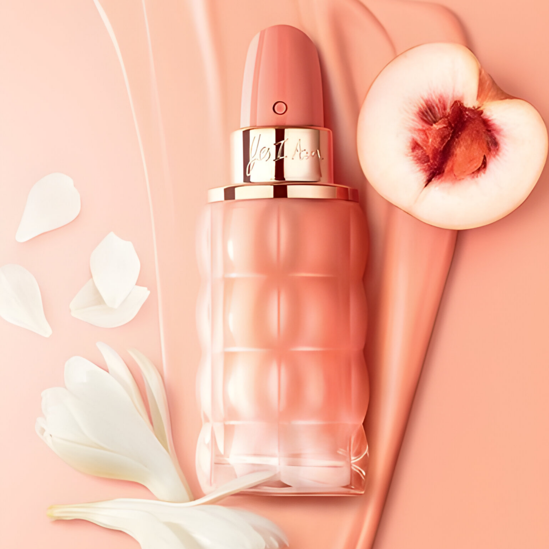 This product has a bright, peachy scent with a heart of white flowers, embodying a fresh and glowing aroma.