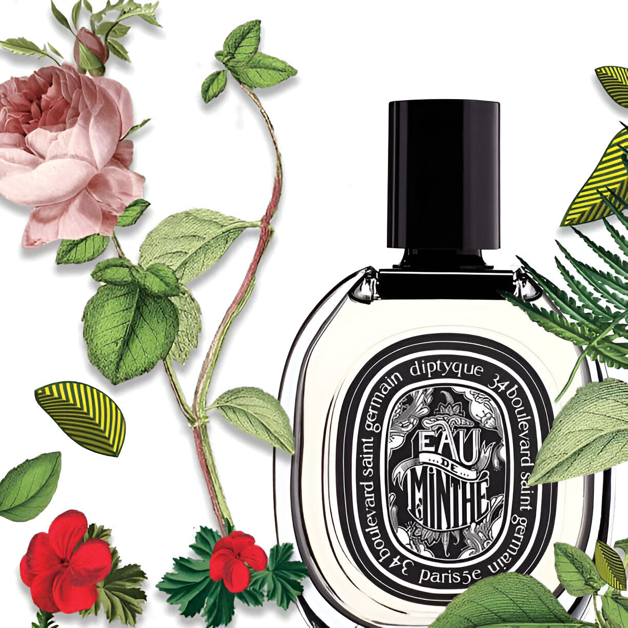 The Diptyque Eau De Minthe EDP smells of refreshing mint and spicy nutmeg, with floral notes of geranium and rose, on an earthy patchouli base.