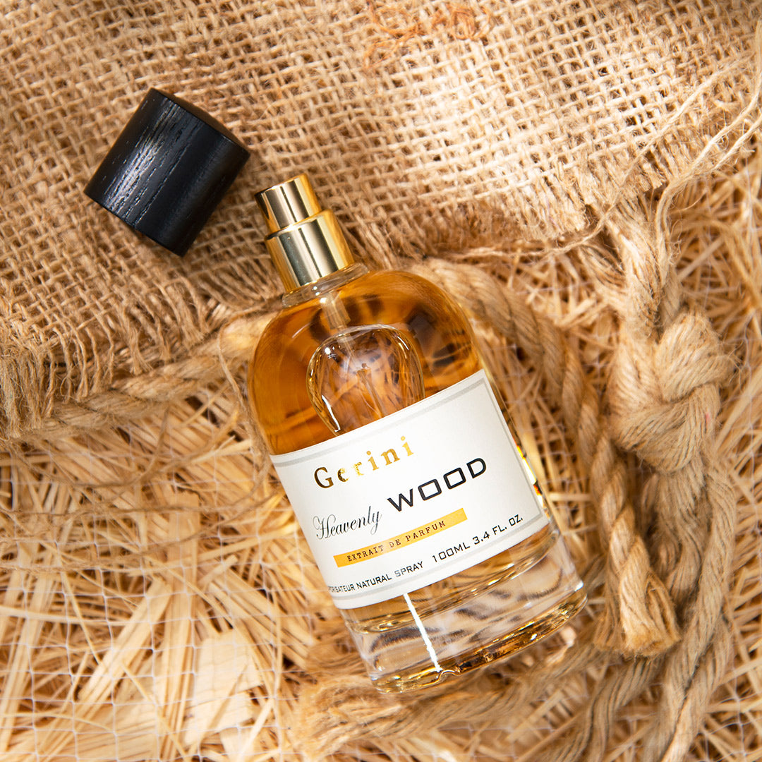 Gerini Heavenly Wood Extrait De Parfum smells like a lovely mix of fresh roses and blueberries with warm hints of sandalwood and honey, creating a soothing and inviting scent for everyone.
