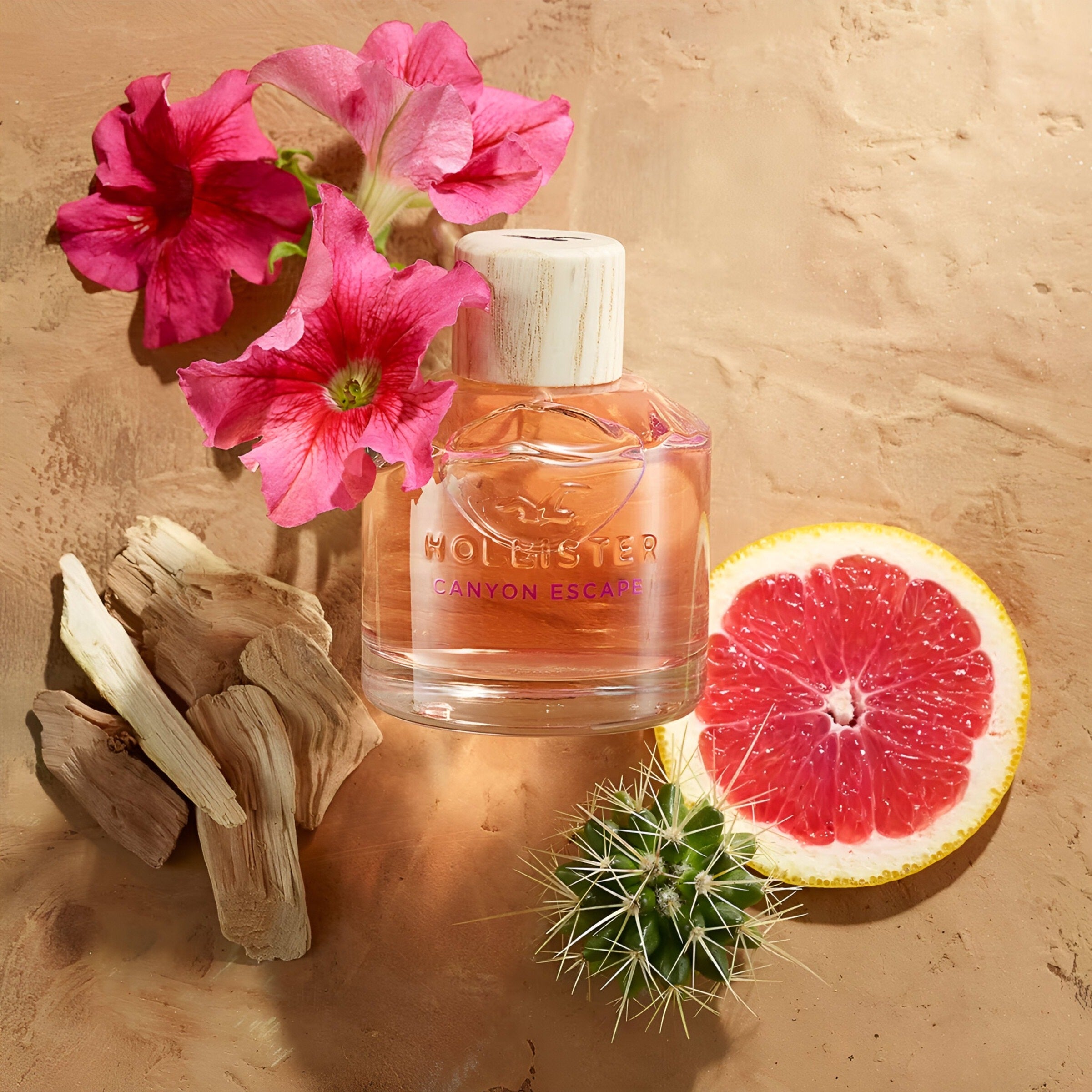 Hollister Canyon Escape For Her EDP smells like a vibrant blend of sweet blood orange, fresh mandarin, and cactus water, intertwined with delicate notes of orange blossom, desert rose, and warm solar accords.