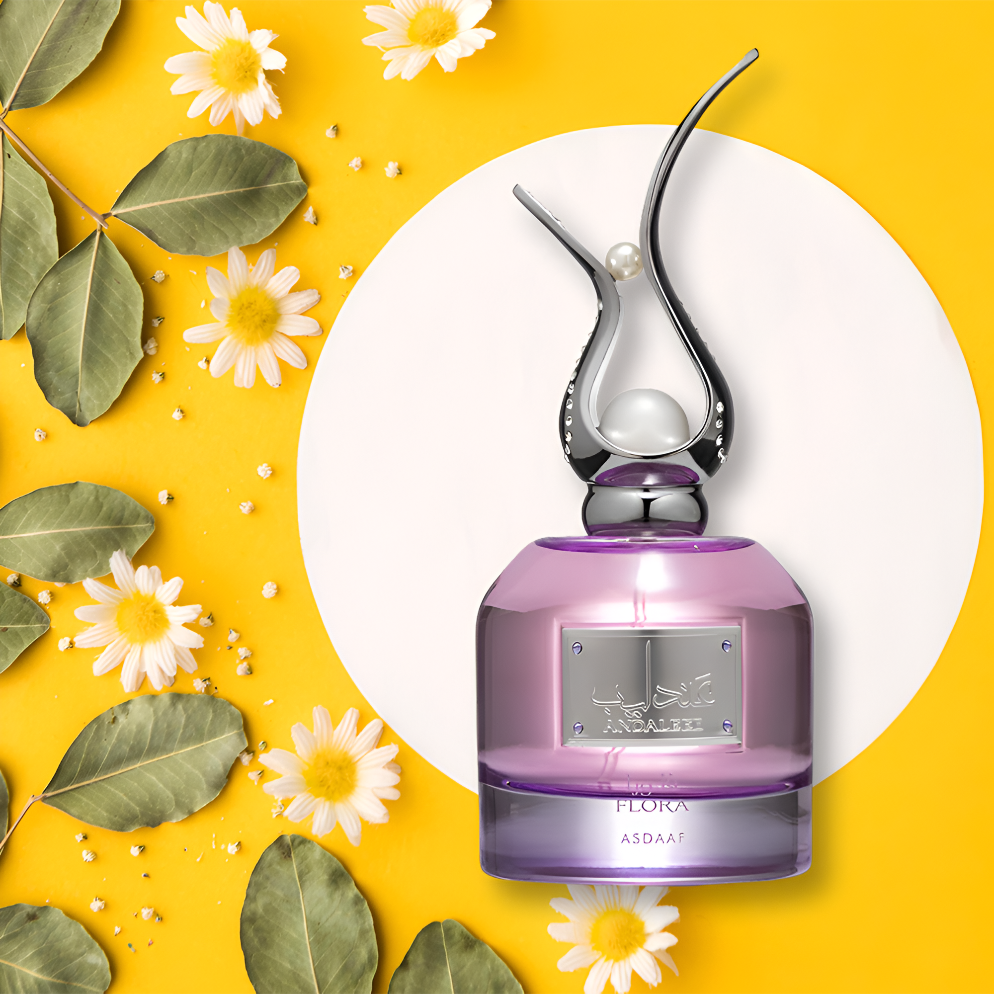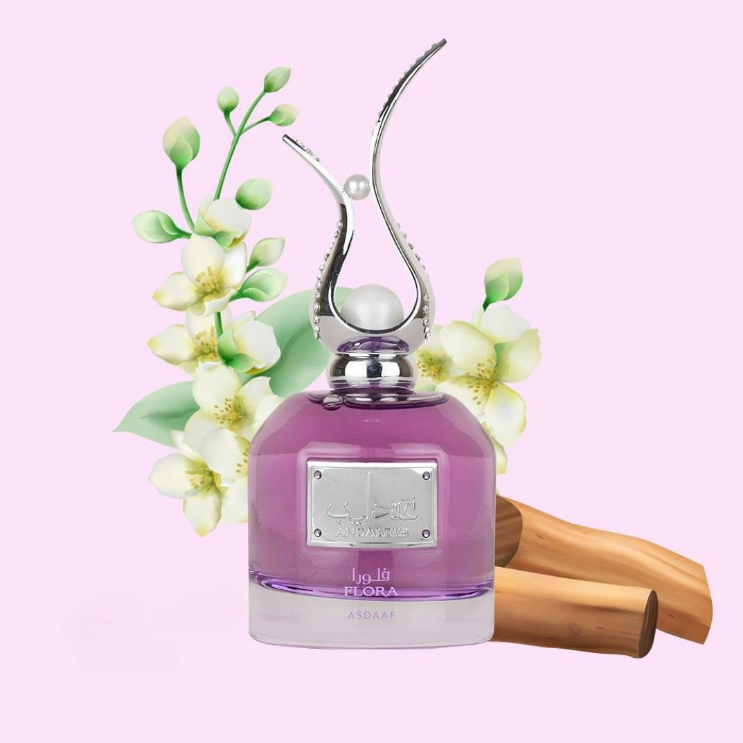 Lattafa Asdaaf Andaleeb Flora EDP: a unisex floral scent with notes of orange, jasmine, rose, sandalwood, and fruits, exuding romance and elegance.