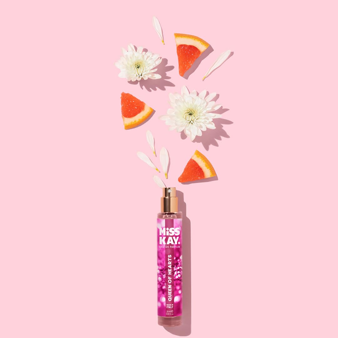 Miss Kay Queen of Hearts EDP smells like a vibrant festival, blending sweet tang, crisp woods, and floral notes to create a warm and inspiring fragrance perfect for confident, free-spirited women.