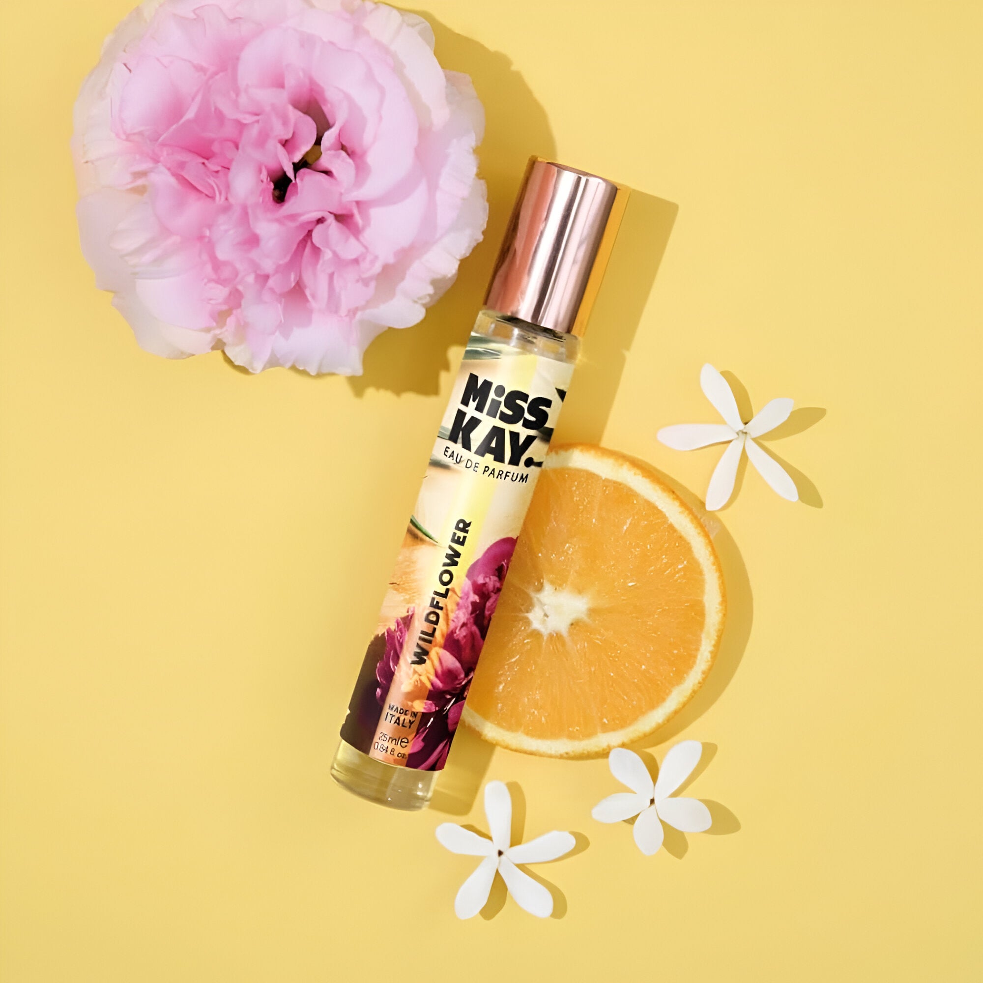 Miss Kay Wildflower EDP smells like a refreshing blend of sweet fruits, sparkling citrus, and soft floral notes, capturing the essence of adventure and a free-spirited vibe.
