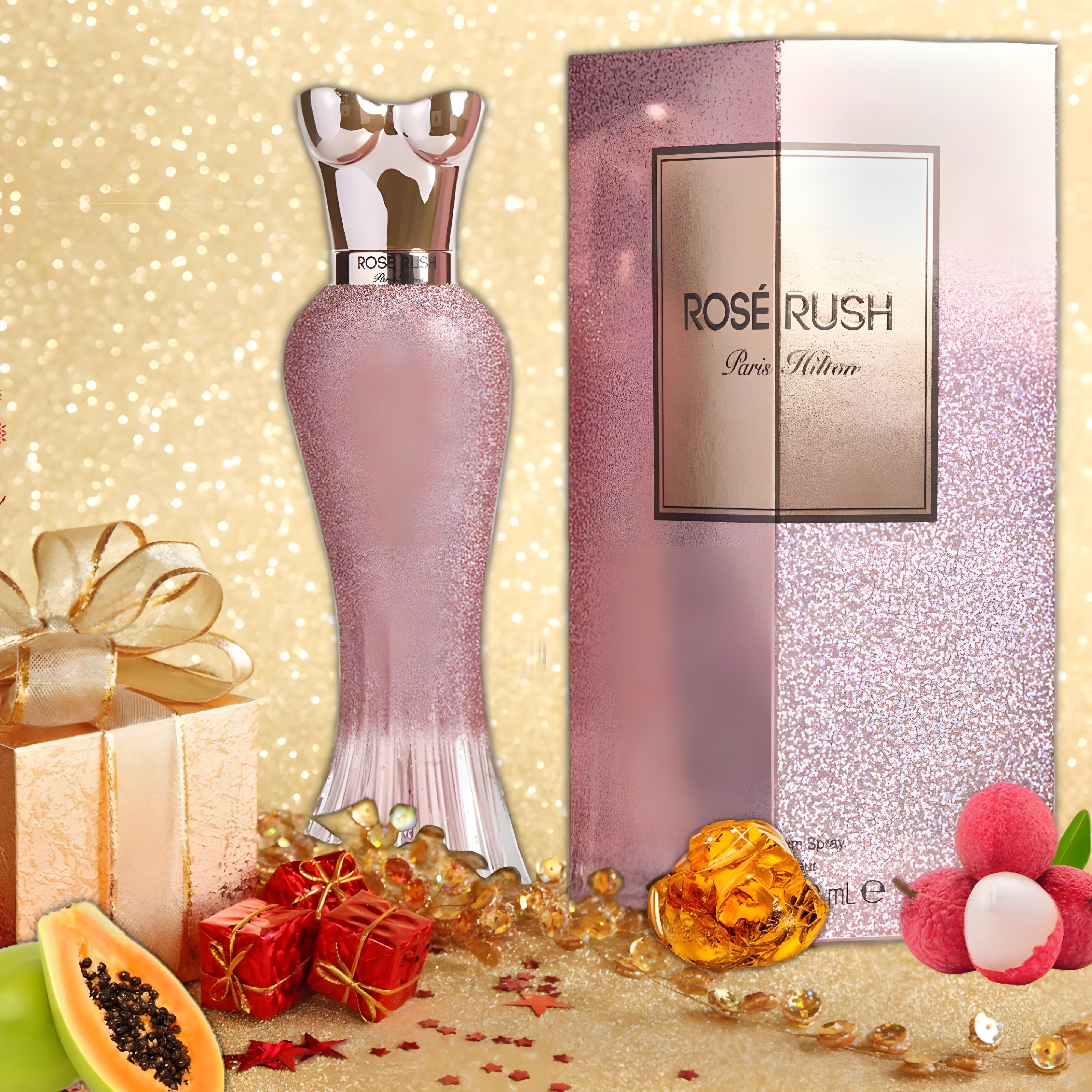 Paris Hilton Rose Rush EDP smells like a romantic blend of floral and fruity scents, with hints of papaya, peony, cedar, white musk, and enhanced rose petals.
